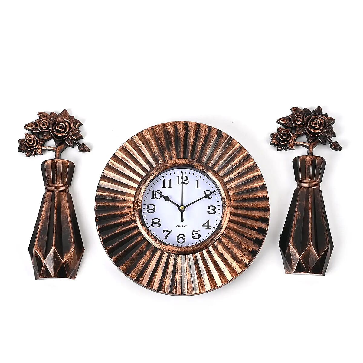 Bronze Color Wall Clock (1xAA Battery Not Included) and 2pcs Vases