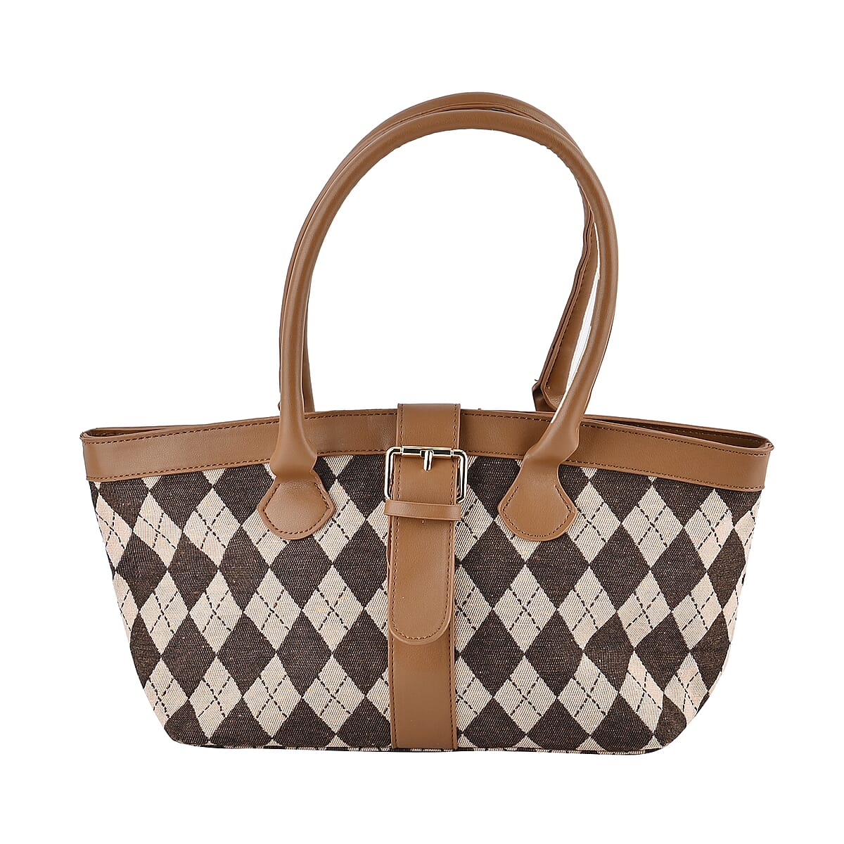 Brown and Khaki Checkered Pattern Faux Leather Tote Bag