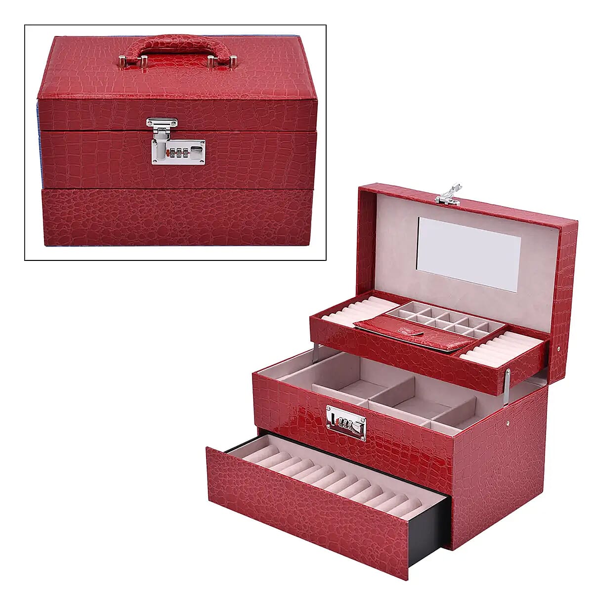 Burgundy Crocodile Embossed Faux Leather Convertible Jewelry Box with Padlock, Jewelry Storage Box for Women, Jewelry Case, Jewelry Organizer