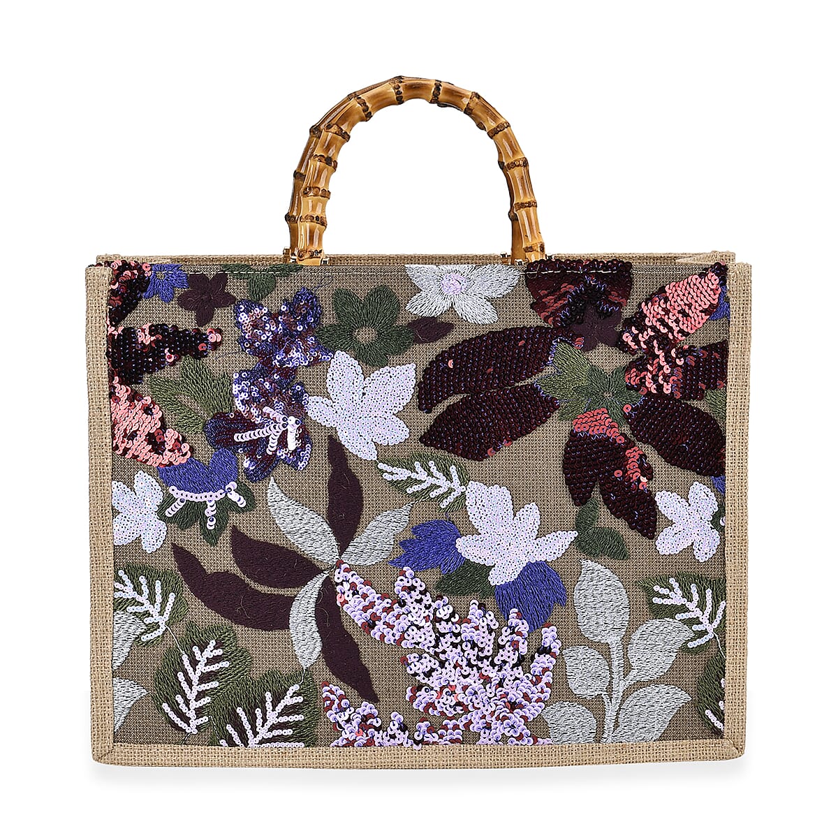 Burgundy with Flower Sequin Tote Bag with Bamboo Handle Drop