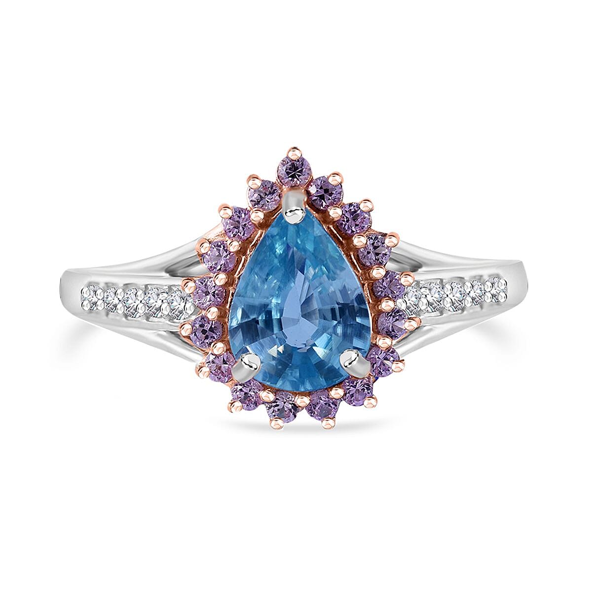 This Cambodian blue zircon and multi-gemstone sunburst ring in sterling silver captures the essence of radiance and color. Centered around a vibrant blue zircon, a halo of pink sapphire artistically frames it, providing a stunning contrast and a lively play of colors.