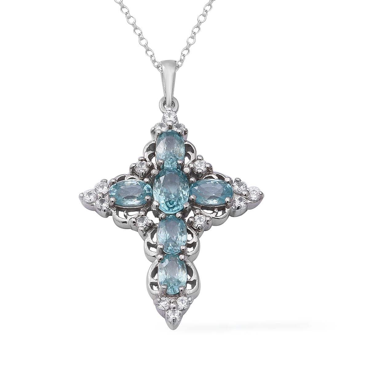 Cambodian Blue Zircon and Natural White Zircon Cross Pendant Necklace 18 Inches in Platinum Over Sterling Silver 5.45 ctw