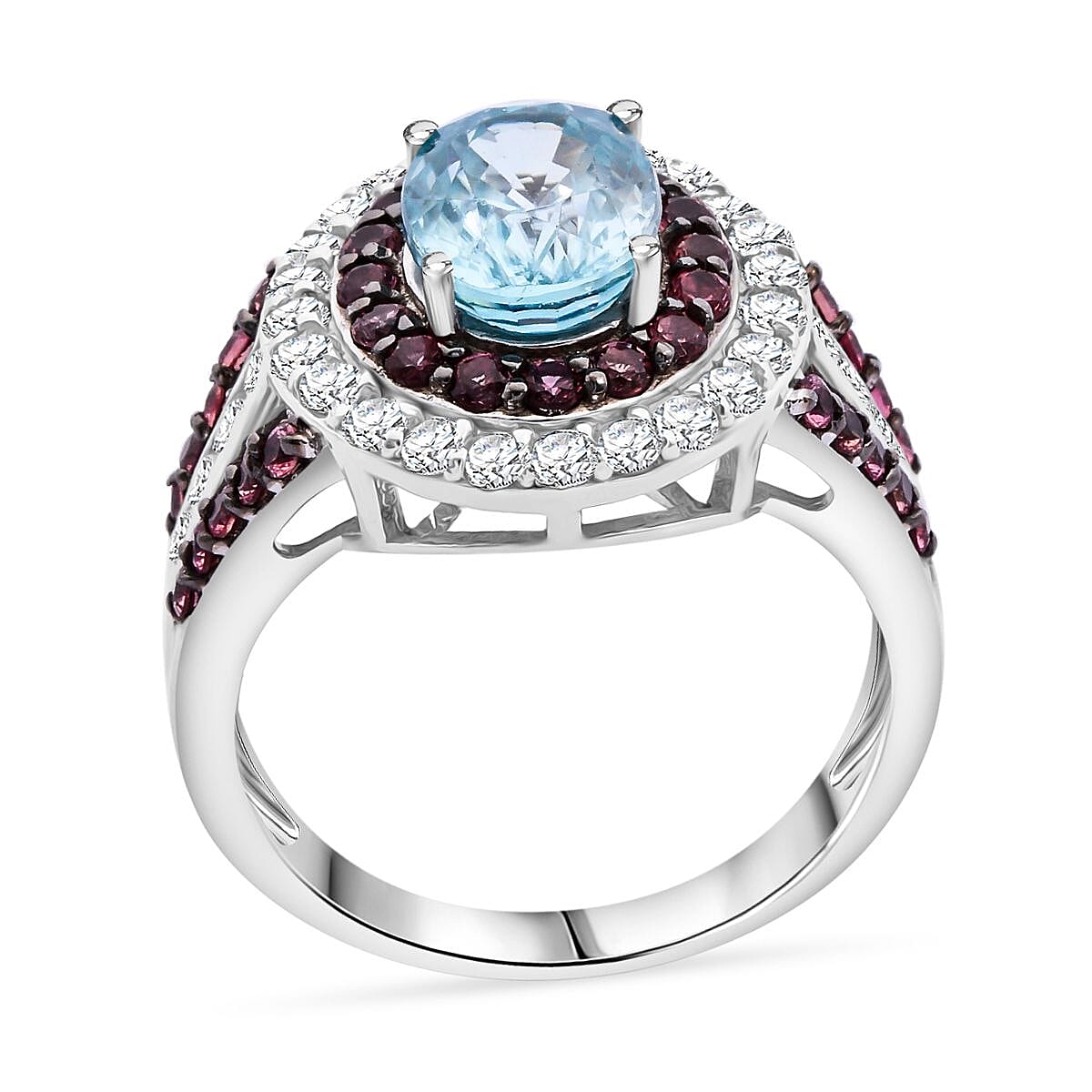 Turn heads with this Cambodian blue zircon ring in sterling silver. The dazzling double halo frames a vivid blue zircon centerpiece. Brown and white zircons add richness and contrast beautifully. This double halo ring reflects refined taste and elegance.