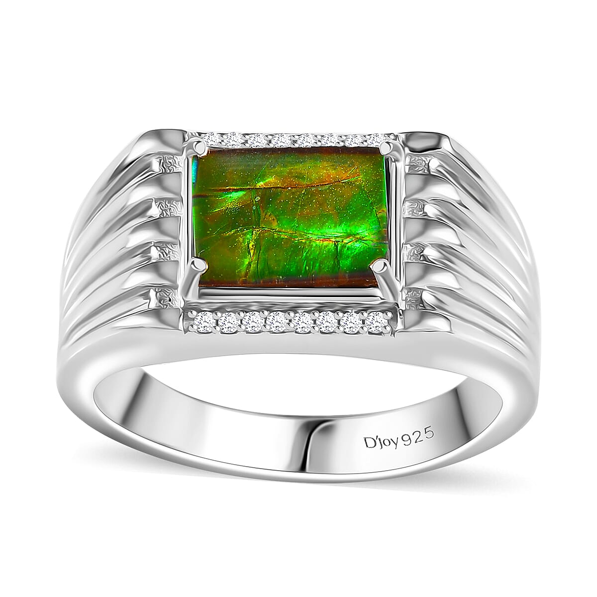 Introducing a distinguished piece, a Canadian ammolite and white zircon men's ring in platinum over sterling silver. This ammolite ring's centerpiece boasts a prong-set ammolite, accentuated by zircon detailing. This ring exudes added luster with textured shank.