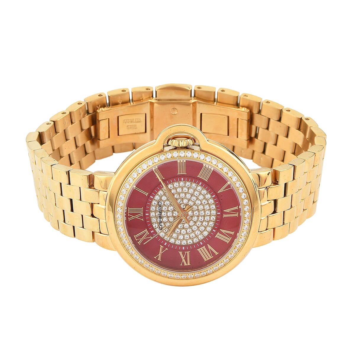CARRERO Toulon Austrian Crystal Swiss Movement Watch in ION Plated YG Stainless Steel With Red Dial (37mm)