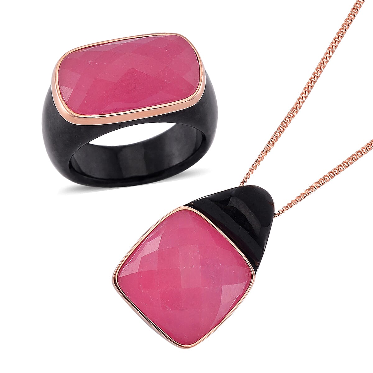 Carved & Faceted Pink and Black Jade (D) 104.00 ctw Band Ring (Size 8) and Pendant Necklace 18 Inches in Vermeil Yellow Gold Over Sterling Silver