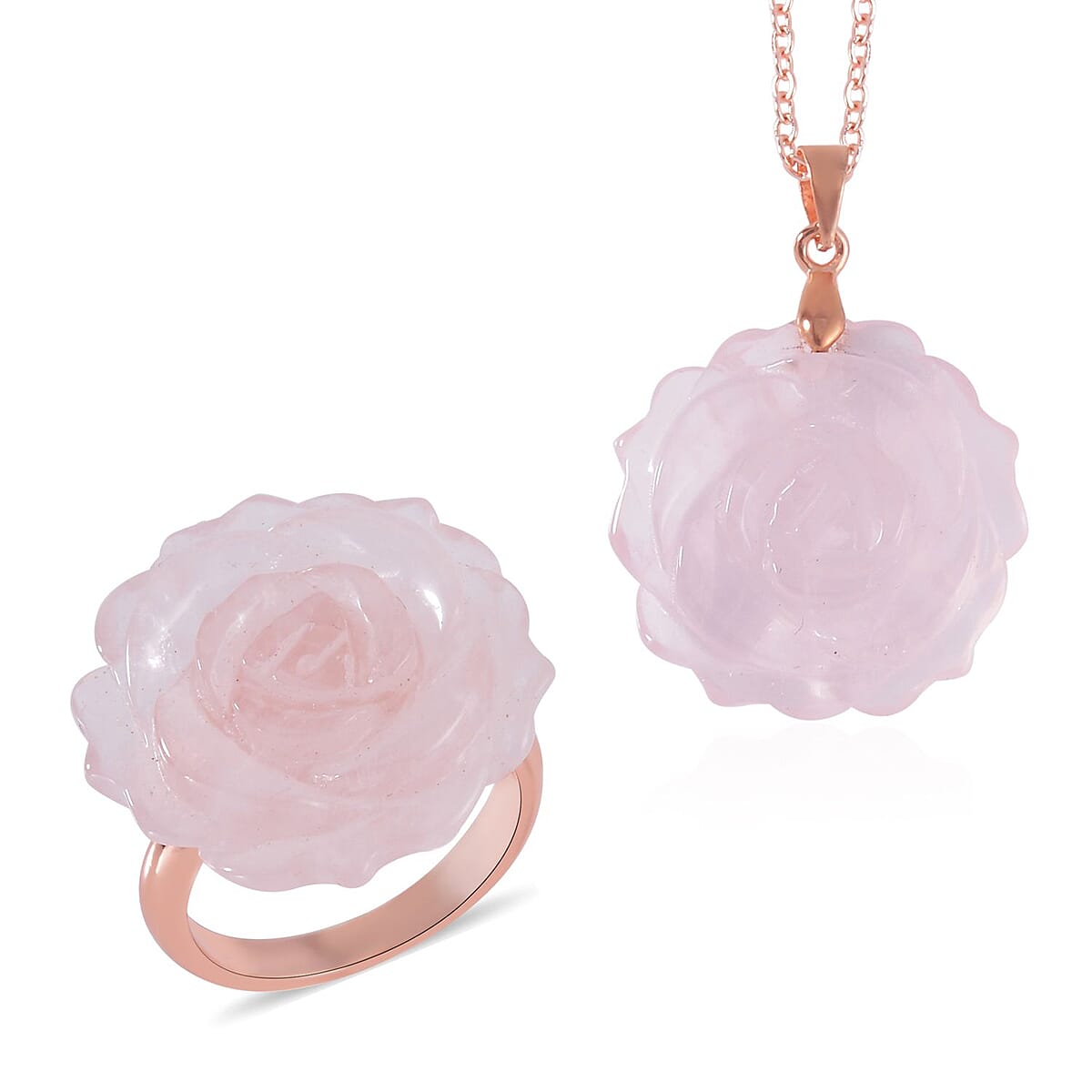 Carved Galilea Rose Quartz Flower Ring (Size 7) and Necklace 20-22 Inches in Rosetone 6.00 ctw