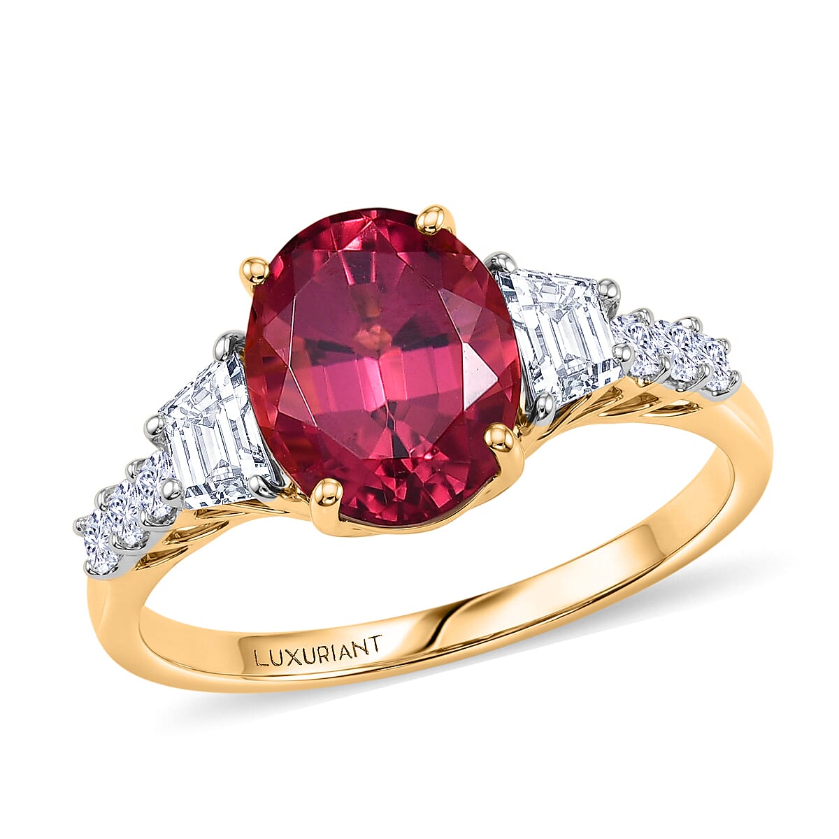 Certified & Appraised AAA Ouro Fino Rubellite and Luxuriant Lab Grown Diamond G-H SI 3.80 ctw Ring in 10K Yellow Gold (Size 6.0)