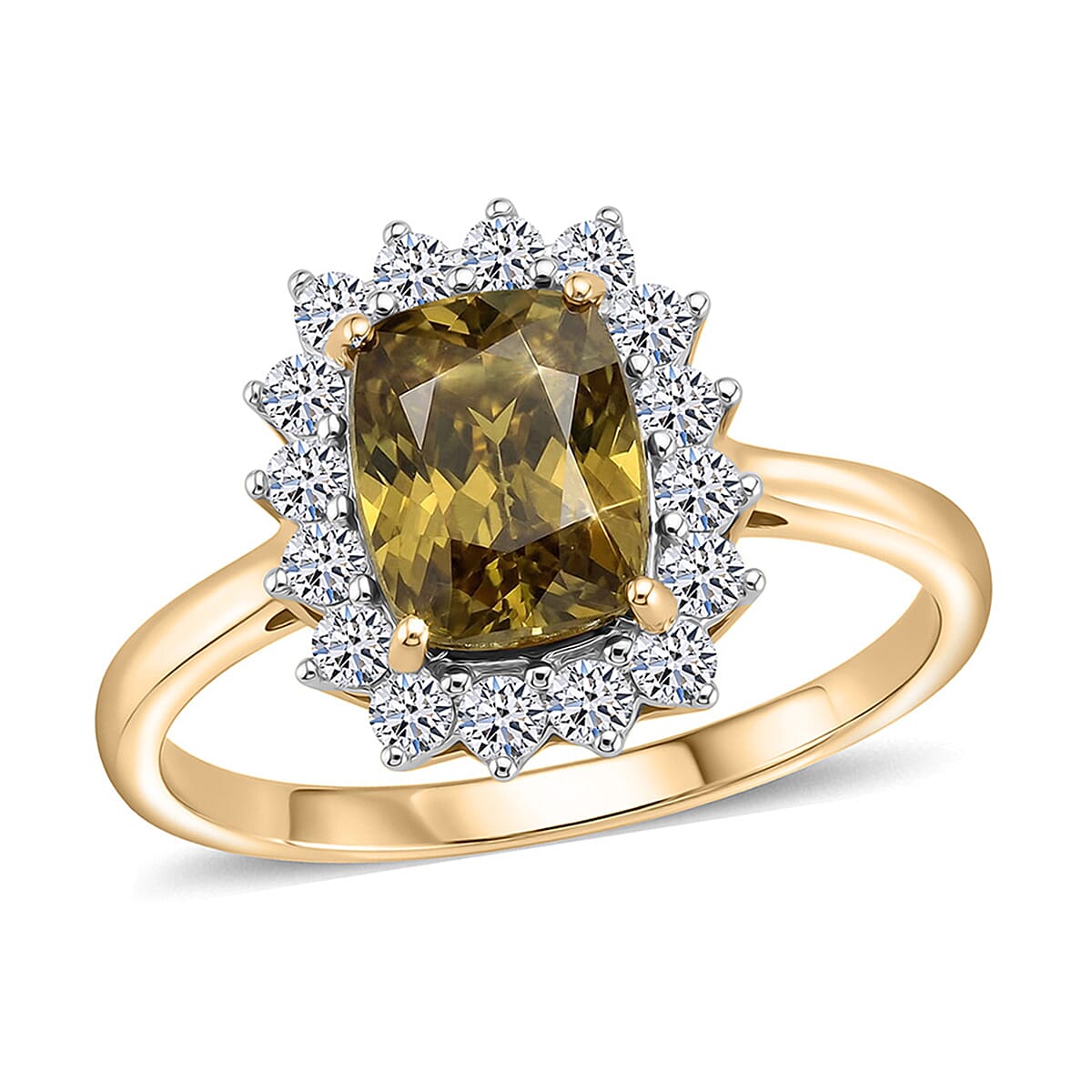 Celebrate your bond with this AAA Sava sphene ring in 10K yellow gold. Sparkling lab-grown diamonds frame the vibrant yellow-green oval sphene in 10K yellow gold. This luxurious gemstone ring symbolizes your commitment, love, and lasting fidelity.
