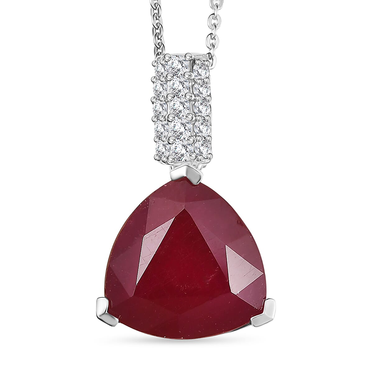 Refine your look with this Niassa ruby and moissanite pendant necklace in 925 sterling silver. This elegant fashion pendant necklace for women features a vivid Niassa ruby accented by sparkling moissanite stones. The 20-inch chain offers a comfortable fit, ideal for special occasions or statement wear.