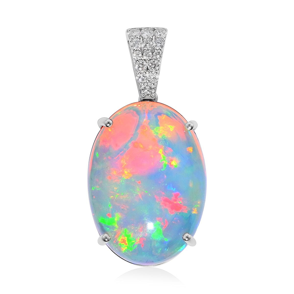 Coordinate this AAA Ethiopian Welo opal and diamond pendant to make a stand-out style statement. This stunning pendant is a creatively crafted pendant dangling in the center with oval-shaped Ethiopian Welo opal. The mesmerizing design is accented with bail engulfed in the shine of luxurious diamonds. Both the used gems are color-contrast. To ensure color uniqueness, bulk gem quantity sourced and sorted. This pendant is crafted in 18K white gold.