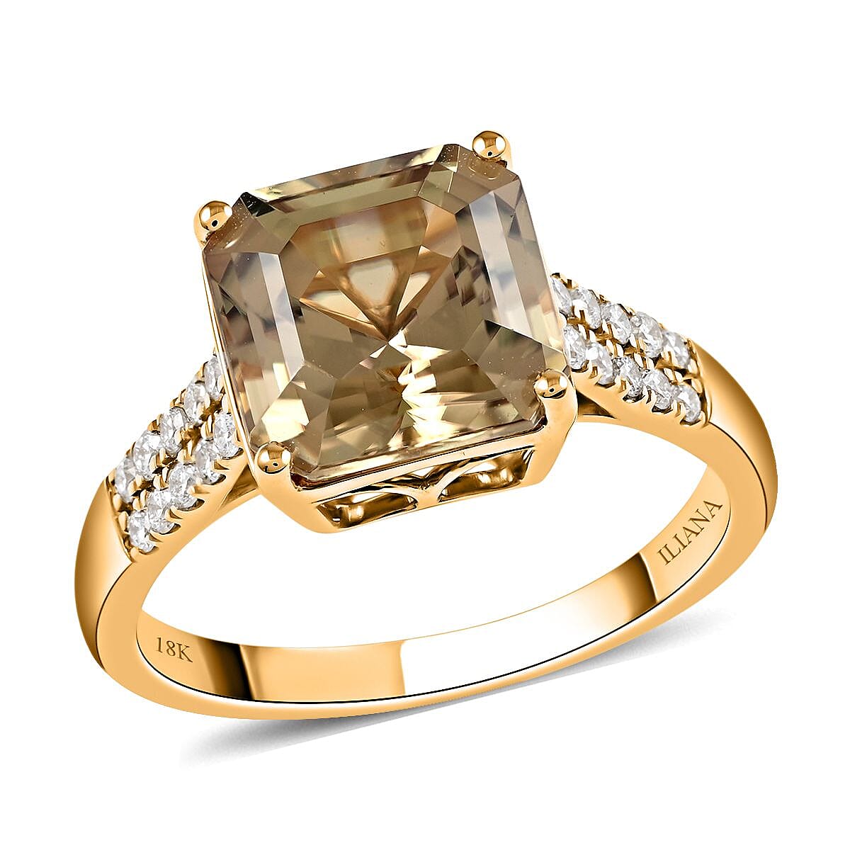 This AAA Turkizite ring honors minimalism withelegance. This ring features a certified and appraised Asscher-cut gem in the centerheld by four prongs.The prong setting is a classic and elegant style that amplifies the brilliance and beauty of the center gem.Radiating more fire and brilliance, the Asscher cut gem gives a different look to the jewelry. This ring from our exclusive Iliana collection showcases the brilliance of diamonds well studded on the shank.AAA grade of the gem describes their excellent quality. The center gem has a beautiful display of color and clarity making this ring look classy and alluring.Turkizite is a rare gem that exhibits a color-changing property representing kiwi-green to pink champagne hues. Made in 18K yellow gold this ring suits all outfits.