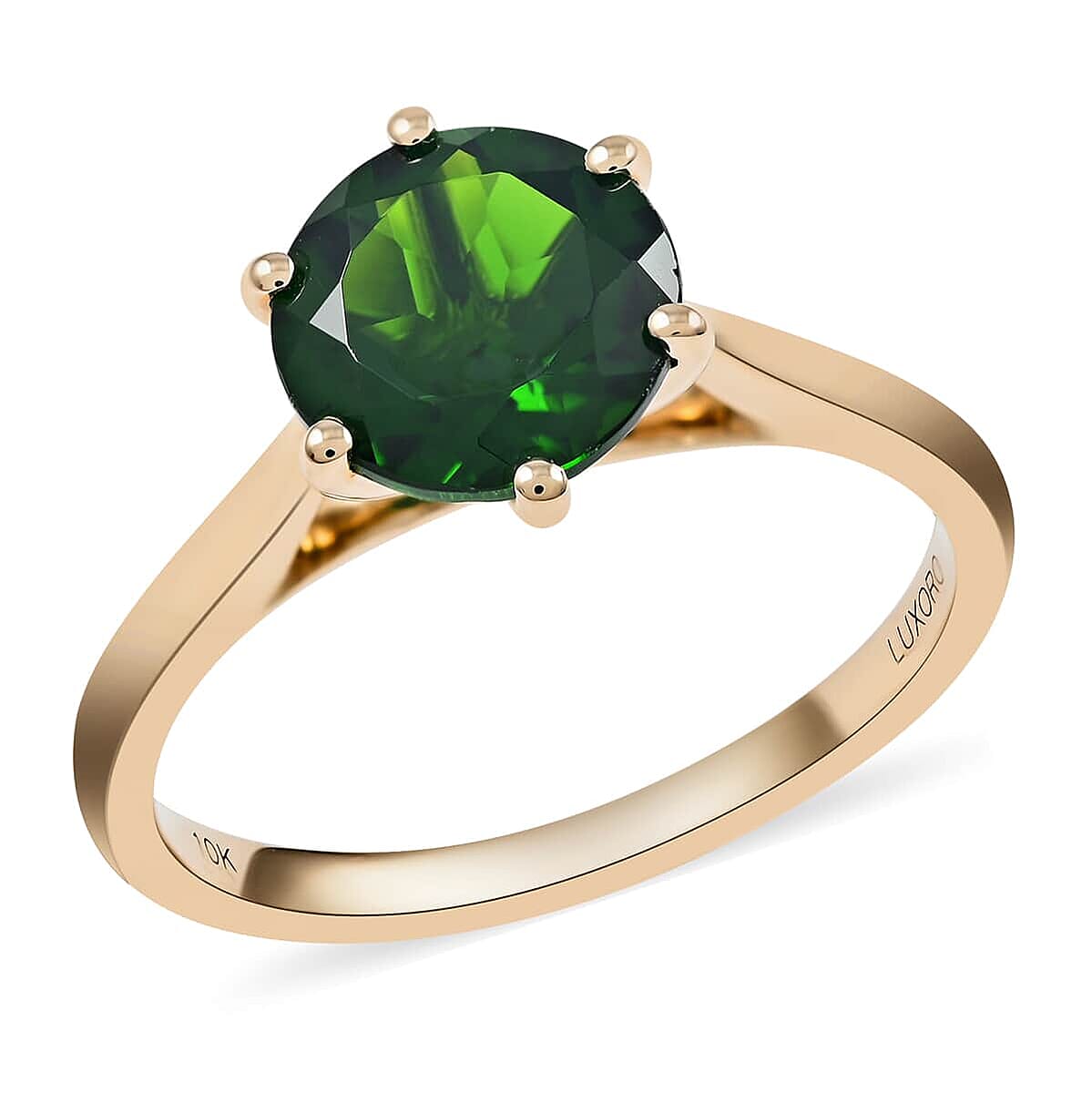 Inspired by a solitaire theme, thisAAA natural chrome diopsidering signifies precious moments in life.Solitaire ring styles are the perfect gift for weddings and anniversaries as they deliver a timeless and classy appeal. Solitaire is a celebration of beauty and brilliance, a perfect sign of your love and commitment and this ring represents the same.This solitaire ring features a round-certified and appraised gem in the center held perfectly in a prong setting safeguarding and intensifying the look.The sleek shank adds a graceful look. Attracting admiration and attention, this piece of jewelry gives a minimalistic look to the outfit, thus making it an excellent option for daily wear. Natural Chrome diopside has a high refractive index, thus making this ring sparkle more. The natural mesmerizing green color of the gem is due to the trace elements of chromium. Crafted in 10K yellow gold, this natural chrome diopside ring from Luxoro Collection suits all outfits.