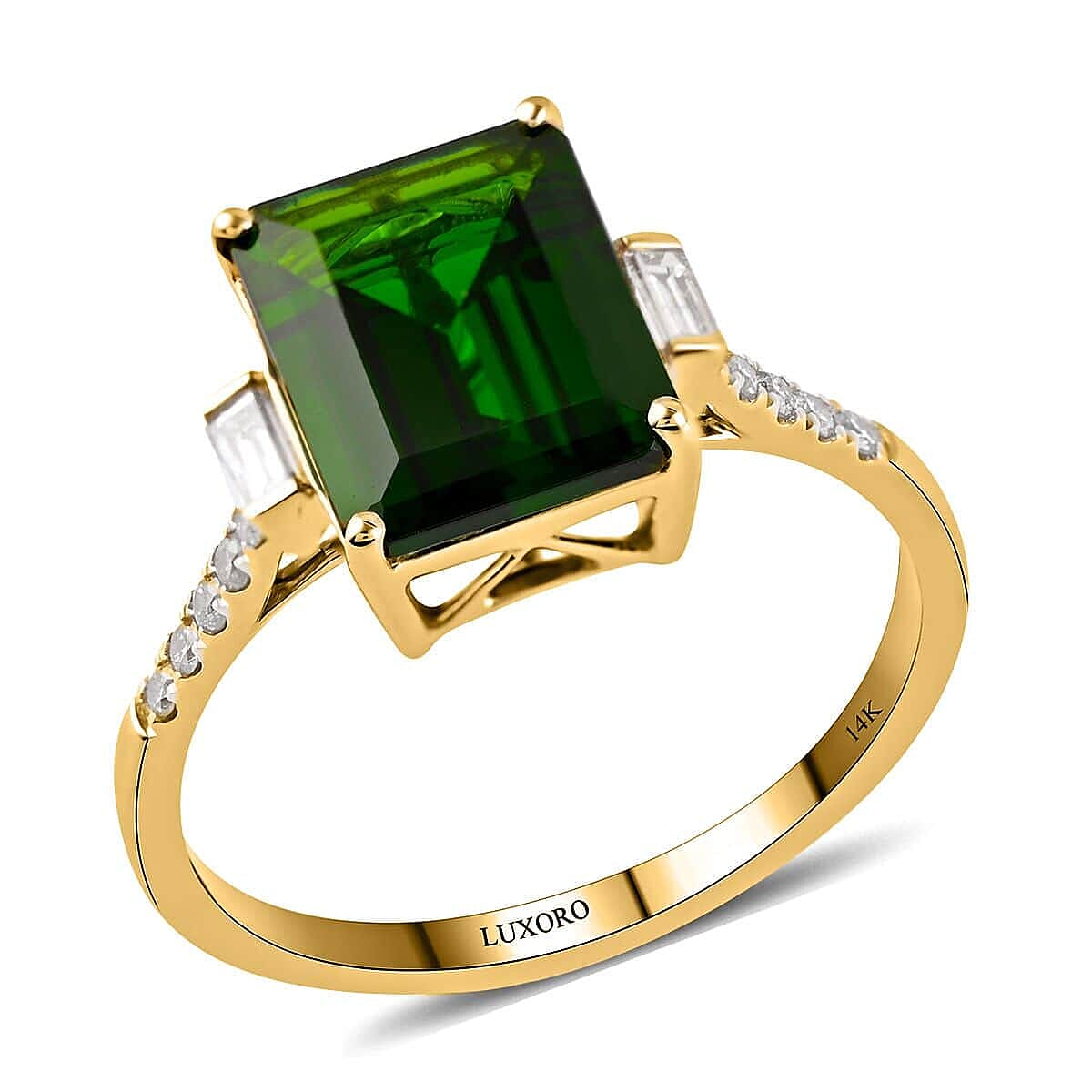 Experience the epitome of luxury with the Luxoro AAA natural chrome diopside and diamond ring in 14K yellow gold - a true masterpiece of fine jewelry that is sure to dazzle and delight. The chrome diopside gemstone itself is a rare and precious find, with its unique green coloration resulting from the presence of chromium in its composition. It is a symbol of growth, renewal, and vitality