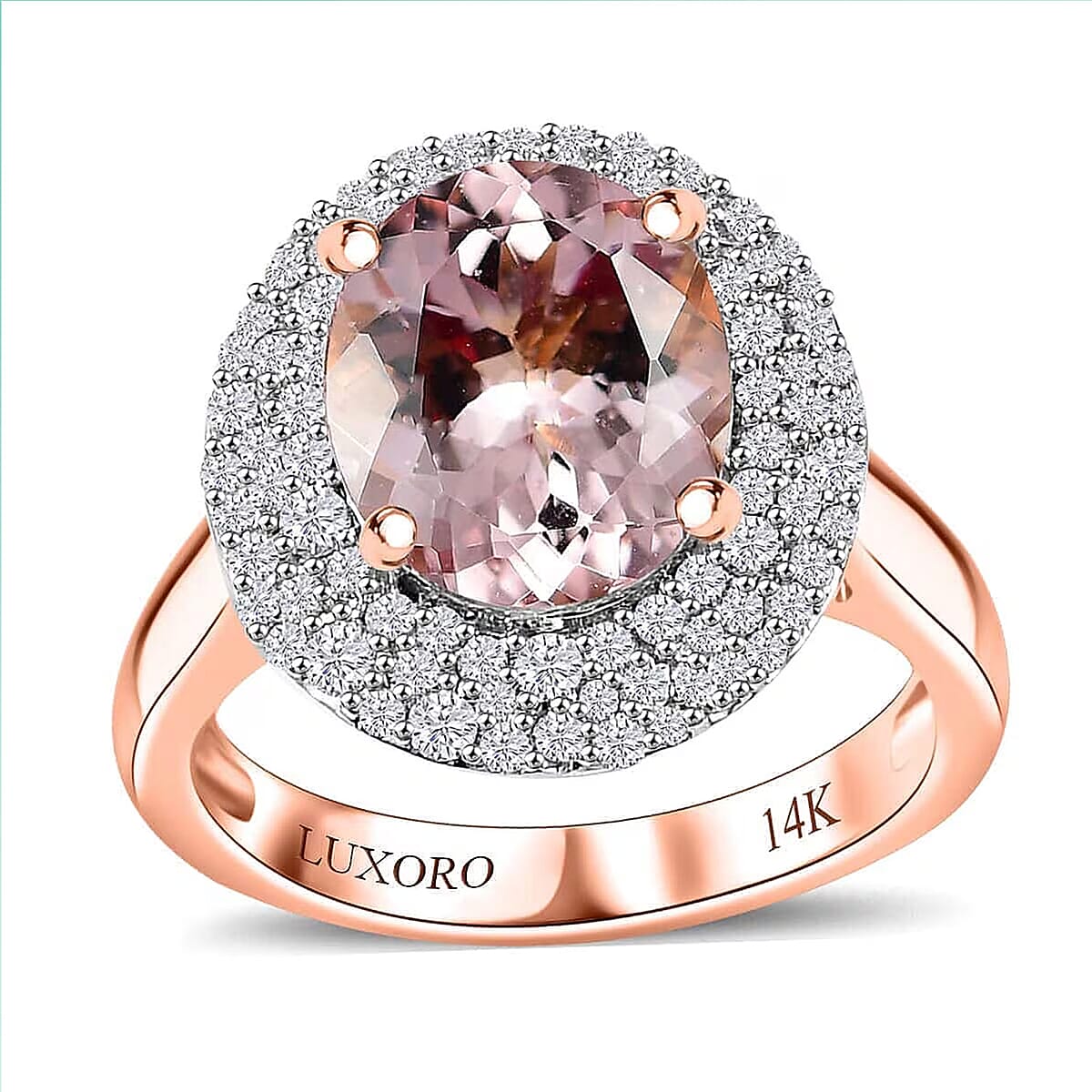 This AAA pink morganite ring for women features a double halo design, symbolizing protection and everlasting love. Part of the Luxoro collection, this 14K rose gold ring showcases a prong-set oval-shaped certified AAA pink morganite in the center, encircled by dual halos of diamonds.