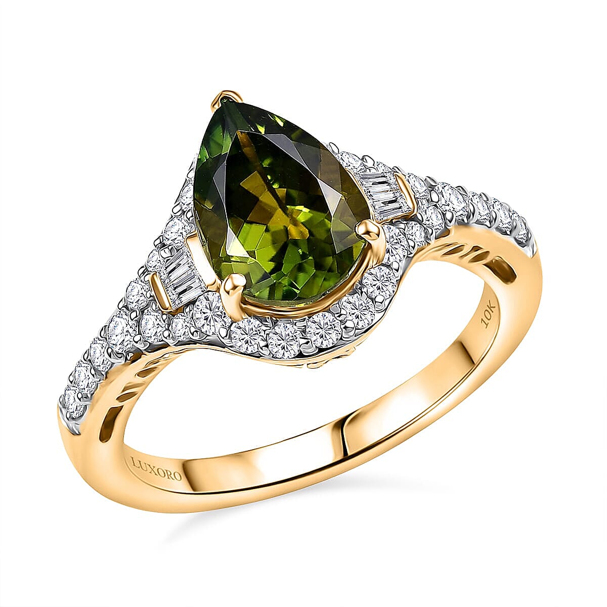Shine with sophistication wearing this Luxoro green tourmaline ring in 10K yellow gold. The certified AAA Sapo green tourmaline makes a bold, impressive statement piece. You’ll appreciate how this 10K yellow gold ring blends luxury with elegant design perfectly.