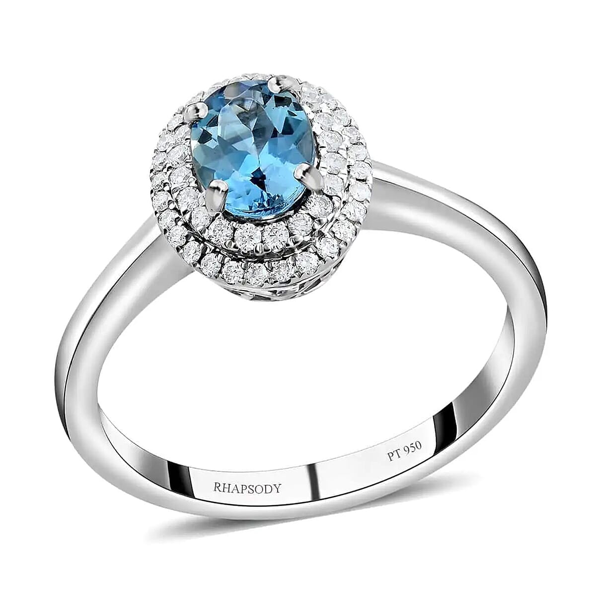 This Rhapsody AAAA Santa Maria aquamarine ring features an oval-shaped gemstone encased in the dual halo of diamonds. Set in 950 platinum, this women’s ring is certified and appraised, a testament to unparalleled craftsmanship and luxurys.