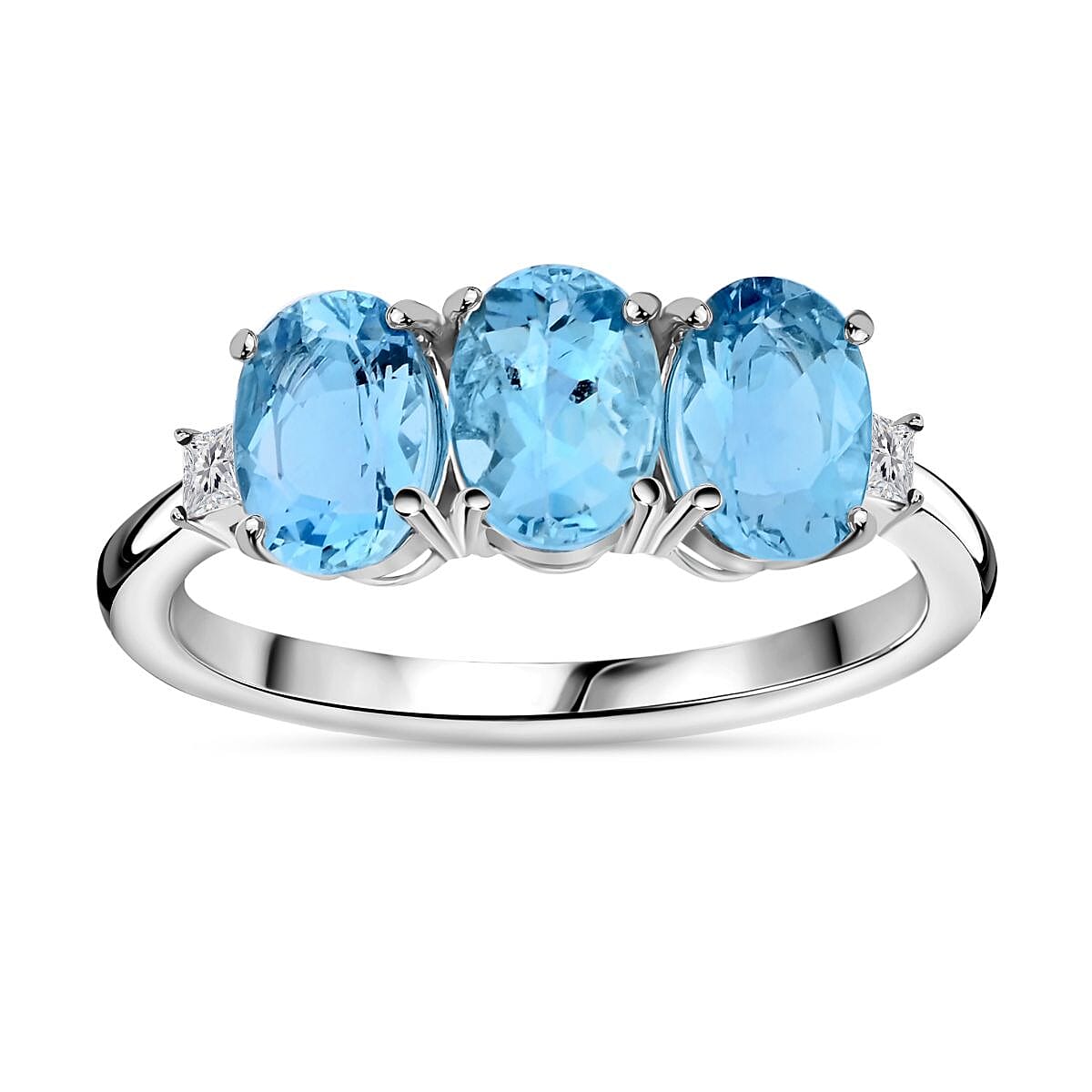 Elevate your jewelry collection with our exquisite Rhapsody AAA Santa Maria aquamarine and diamond ring. Set in 950 platinum, this three-stone ring features a central oval-shaped Santa Maria aquamarine flanked by brilliant diamonds, representing the past, present, and future.