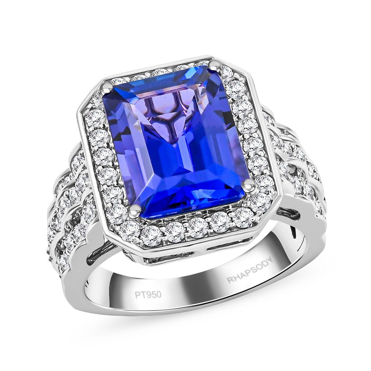 Indulge your senses and awaken your style with the luxurious, rare, premium Rhapsody AAAA tanzanite. This bewitching 950 platinum ring, dancing with a halo of diamonds and lavishly adorned shank, is more than a statement piece, it's a declaration of splendor and discerning taste.