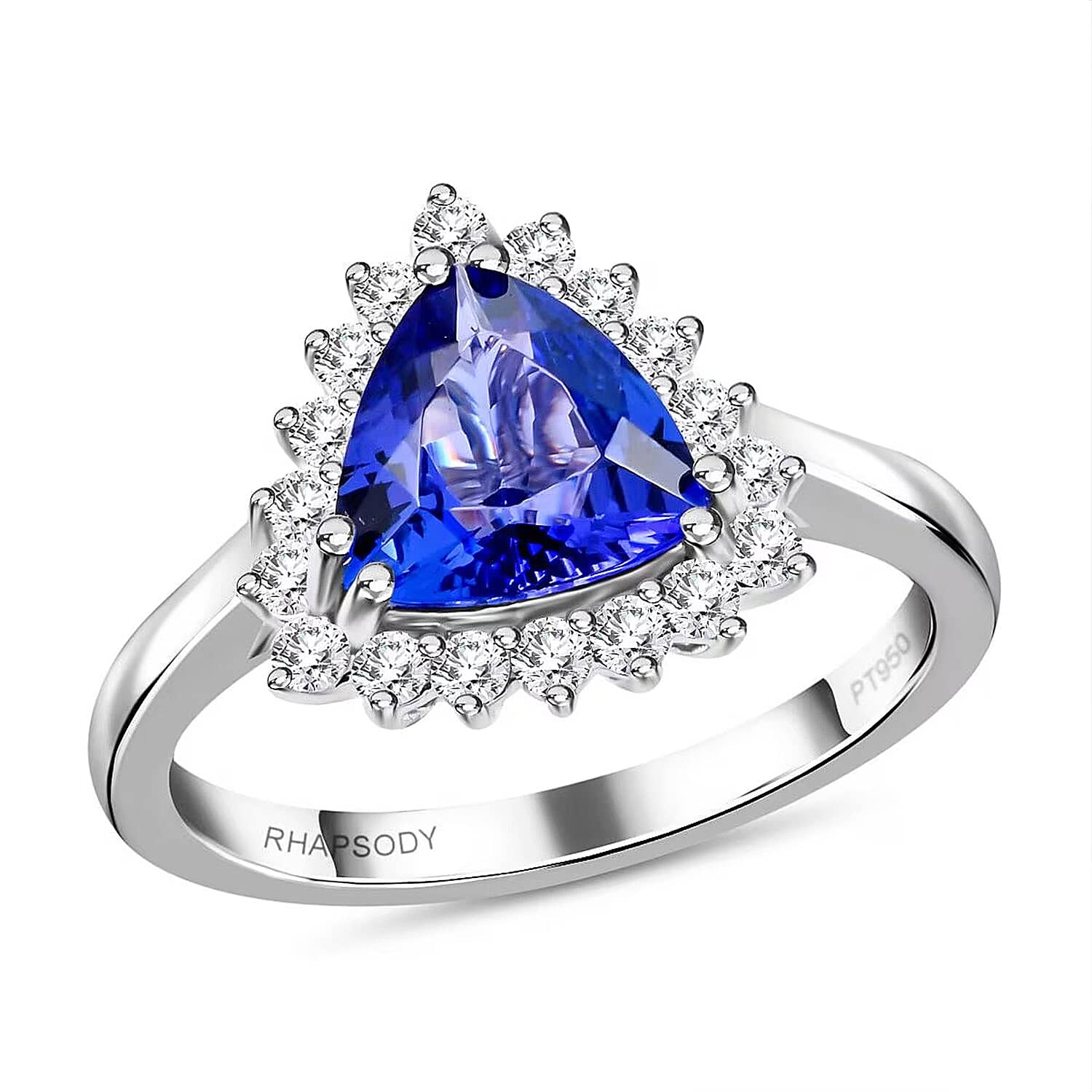 Celebrate bold beauty with this certified Rhapsody 950 platinum AAAA tanzanite ring. You’ll love the unique trilliant cut that catches every glimmer of light. A stunning sunburst halo of diamonds enhances your sparkle and sophistication. This platinum ring is crafted to match your desire for elegance that endures.