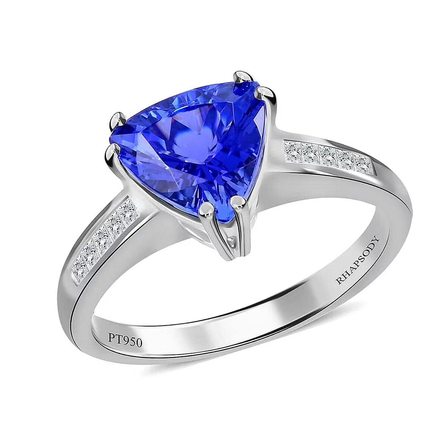 Turn heads with this certified Rhapsody 950 platinum AAAA tanzanite diamond ring. You’ll admire the rare trilliant-cut tanzanite that radiates with vivid hues. Square diamonds on the band add bold sparkle to your everyday luxury. Crafted to match your desire for standout style, this platinum ring is a must-have