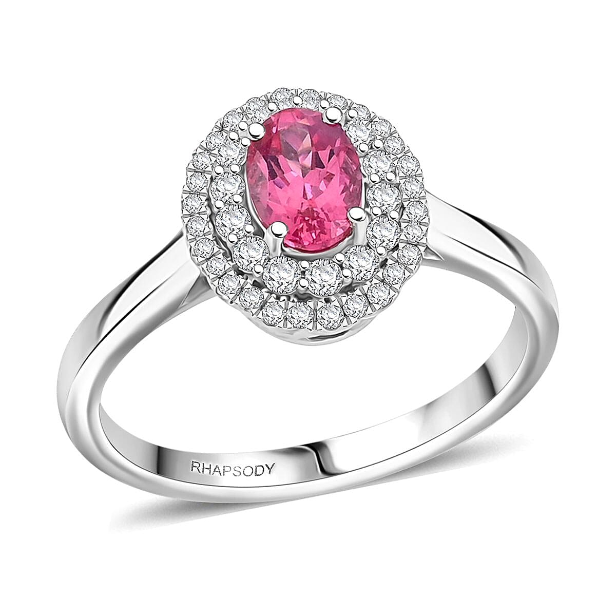Capture every eye with the Rhapsody Mahenge pink spinel ring in 950 platinum. The elegant halo design showcases a vivid center stone encircled by brilliant E-F VS diamonds. This 950 platinum ring is a true symbol of exceptional taste and refined elegance.