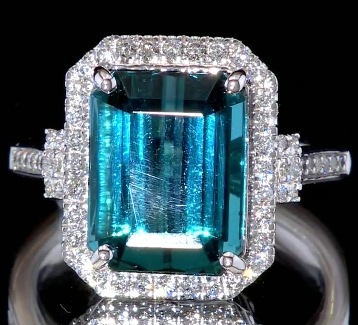 Certified & Appraised Rhapsody AAAA Pirineu Lagoon Tourmaline and E-F VS Diamond 10.10 ctw Ring in 950 Platinum (Size 8.0) 9.25 Grams