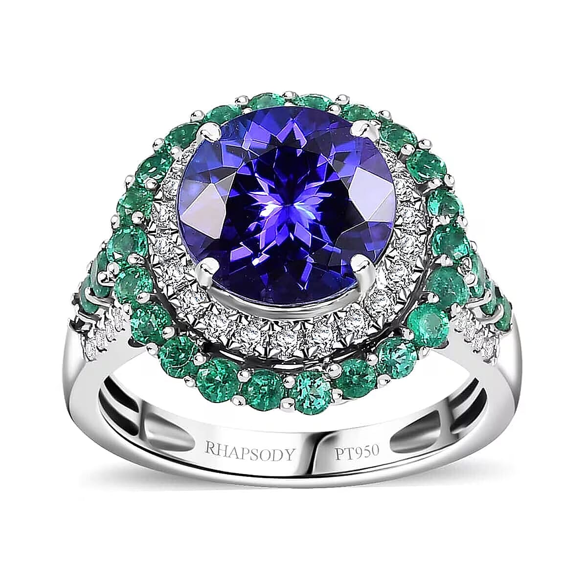 Upgrade your style with this Rhapsody AAAA tanzanite, emerald and diamond ring in 950 platinum. This elegant gemstone ring for women features a vibrant tanzanite center, accented with Colombian emeralds and sparkling diamonds. Perfect for celebrating special moments with refined elegance.