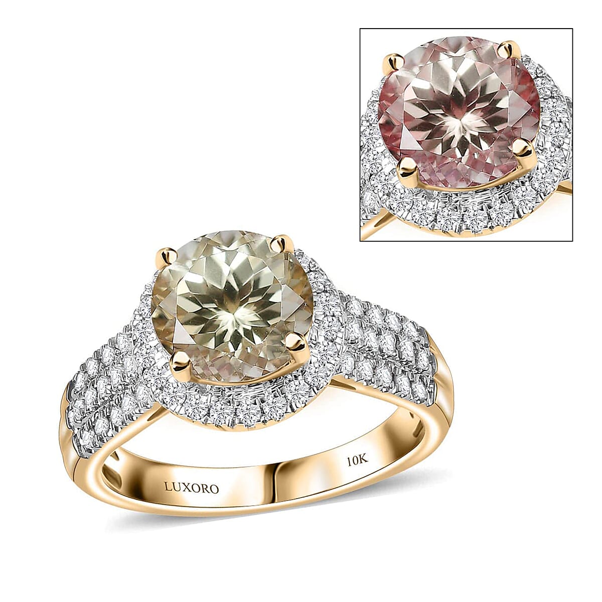 This Luxoro AAA turkizite ring in 10K yellow gold is inspired by the Art Deco design. It features a certified and appraised AAA-grade turkizite coveted for its unique color-changing feature. All gemstones are securely set in prong settings.