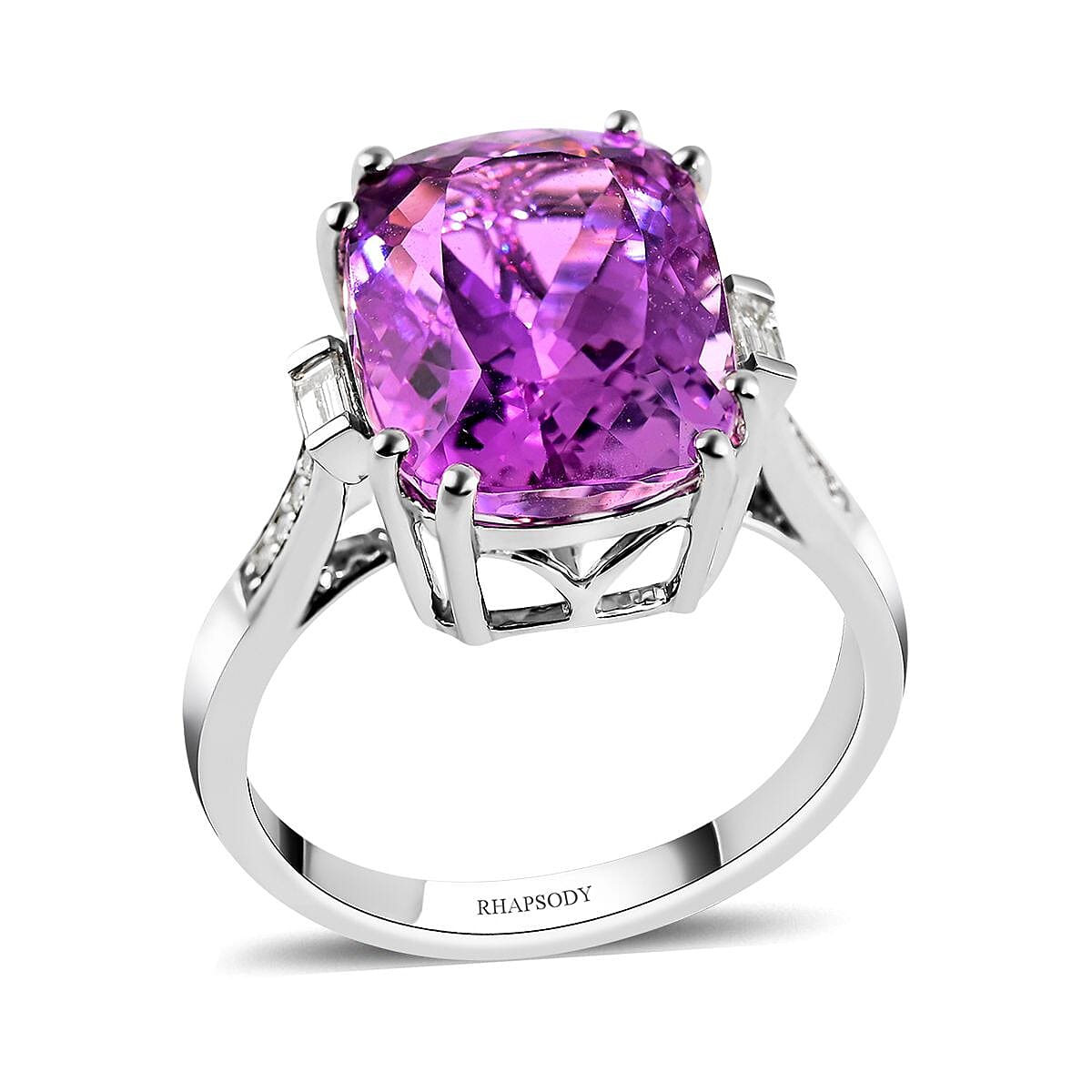 Inspired by the glow of pinkish-lilac sun rays during nightfall, this Rhapsody AAAA Patroke kunzite and diamond ring casts an infinite glow of illuminance. Dusk symbolizes a mysterious time that serves as the bridge between brightness of the day and darkness of the night. Cushion-shaped kunzite is embellished in the center with a striking geometry of diamonds on the ring shank. Kunzite possesses pleochroic properties as it displays an interplay of colorful hues when exposed to sunlight. AAAA grade of the gemstone offers cut, clarity, defined structure and balanced composition. The gemstone cast a glow of vivid pinkish and purple hues. This kunzite and diamond ring is designed in platinum, offering luxury and extravagance. This metal frame is extremely durable and retains the shine of the ring. The Rhapsody collection offers the finest definition of luxury with precious gemstones enveloped in platinum.