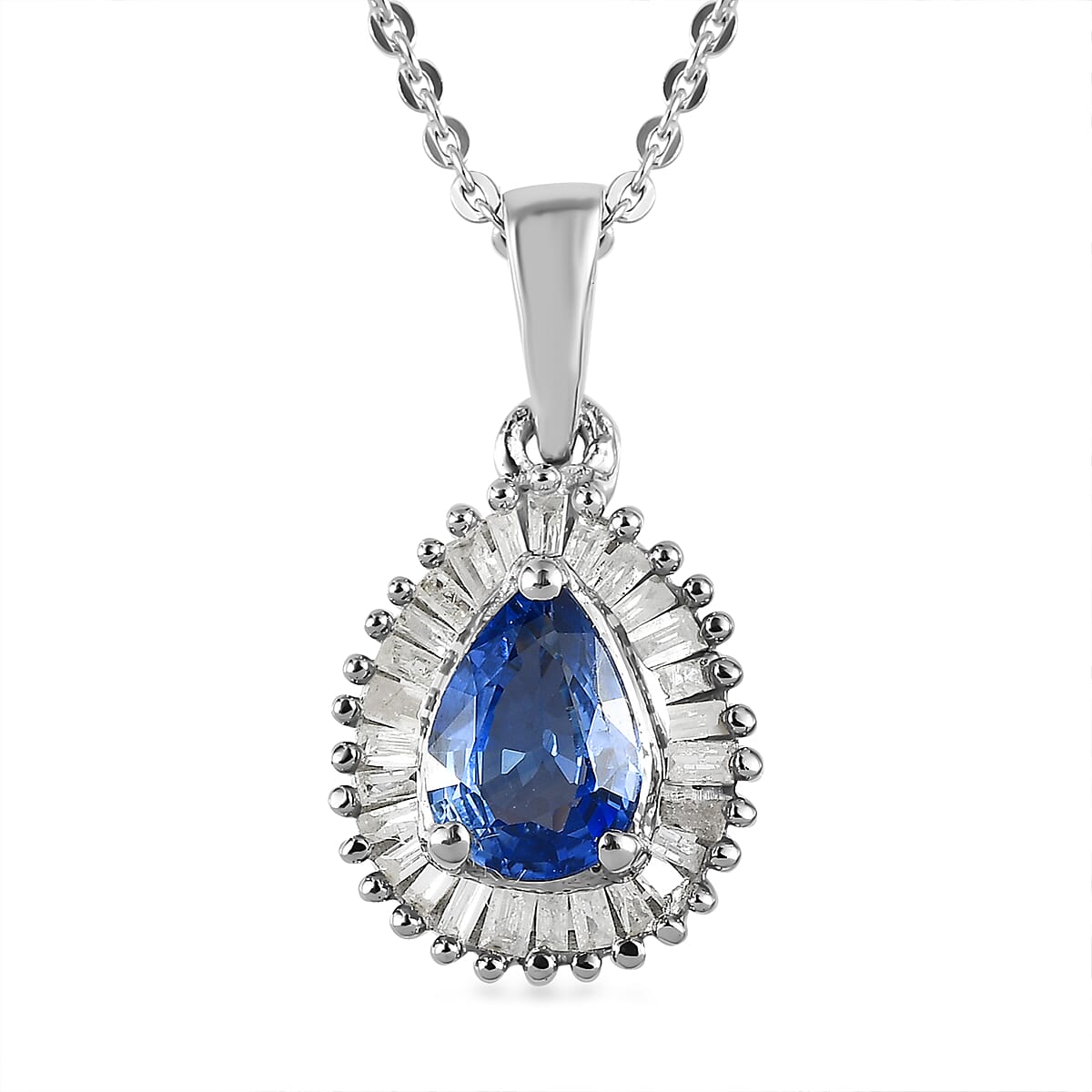 Ceylon Blue Sapphire and Diamond Halo Pendant Necklace 20 Inches in Platinum Over Sterling Silver 1.00 ctw
