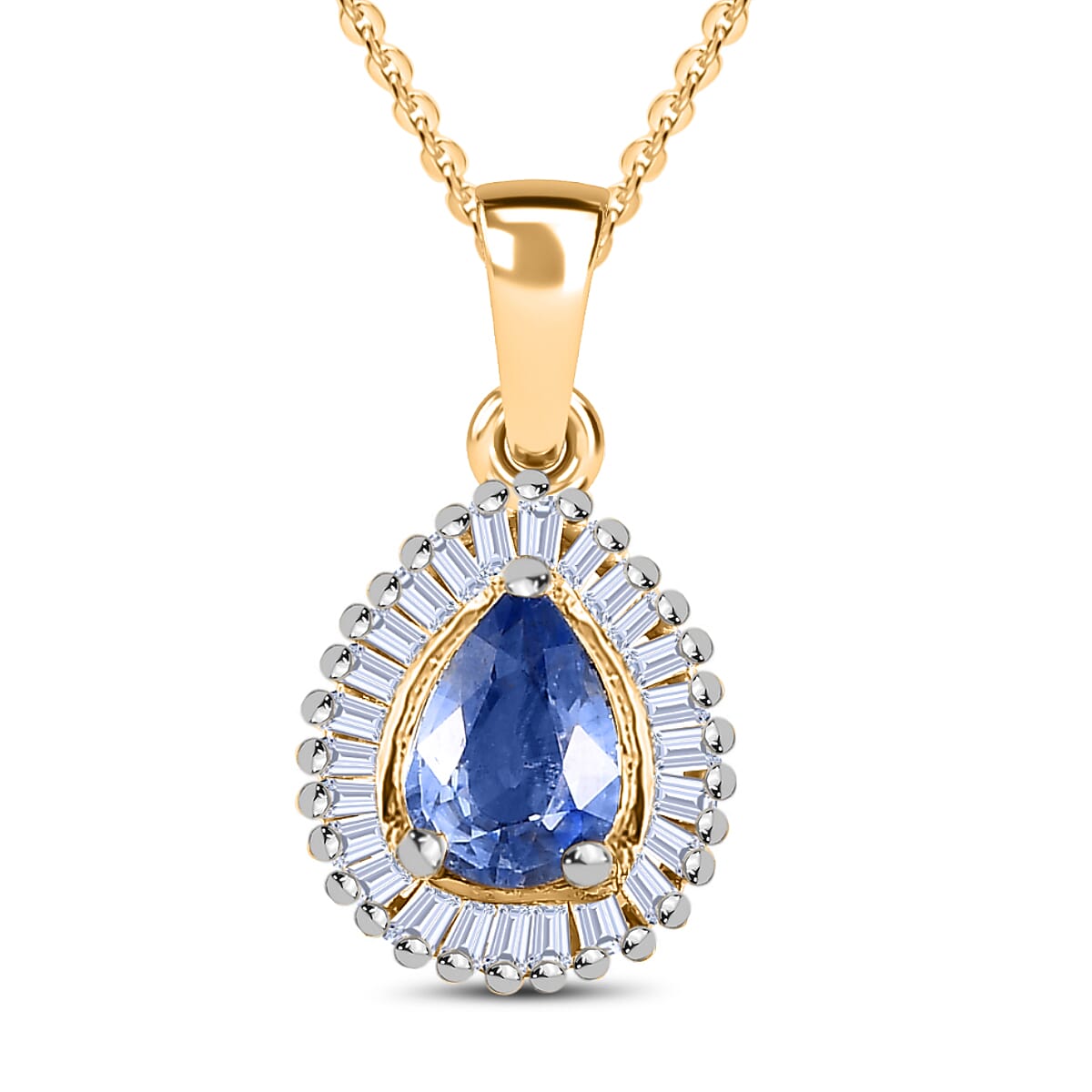 Ceylon Blue Sapphire and Diamond Halo Pendant Necklace 20 Inches in Vermeil Yellow Gold Over Sterling Silver 1.00 ctw
