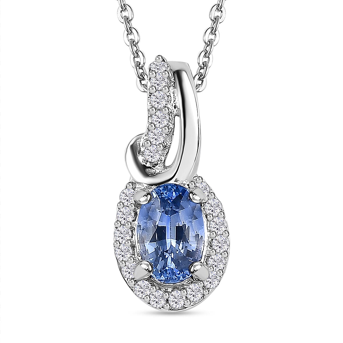 Ceylon Blue Sapphire and White Zircon Halo Pendant in Platinum Over Sterling Silver with Stainless Steel Necklace(20 Inches 0.85 ctw