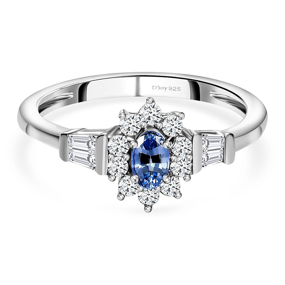 Ceylon Blue Sapphire and White Zircon Sunburst Ring in Platinum Over Sterling Silver (Size 7.0) 1.00 ctw