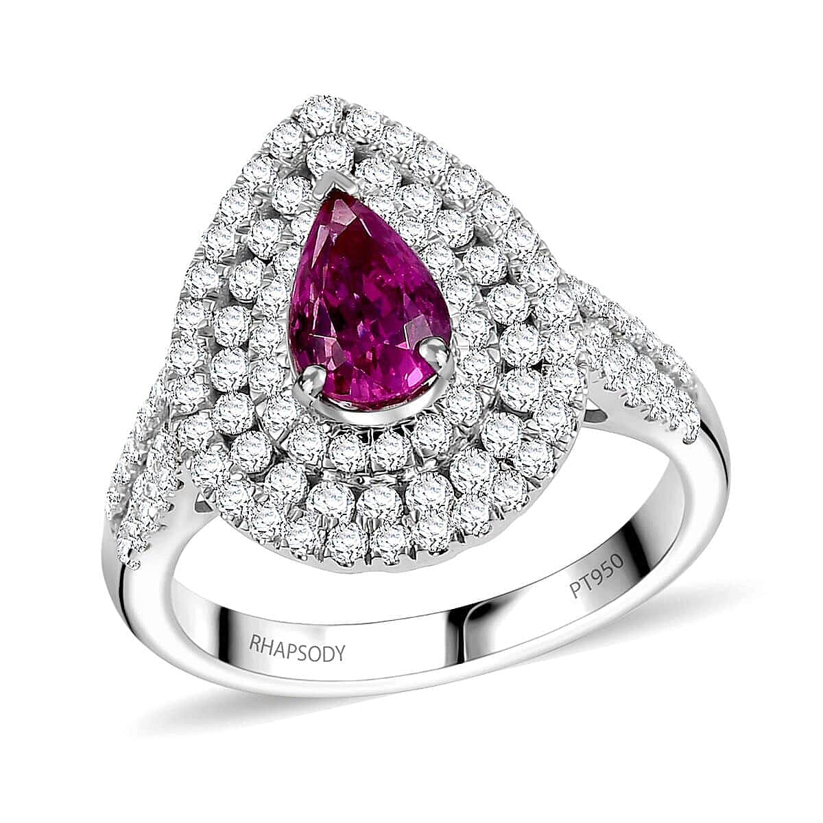 This Rhapsody AAAA Padparadscha sapphire halo ring in 950 platinum exudes timeless elegance and sophistication. This platinum engagement ring features a stunning pear shaped centerpiece beautifully accentuated by halo of sparkling diamonds, perfect for marking life's special moments.