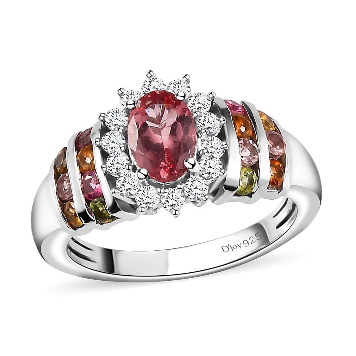 Inspired by a floral halo design, this rose apatite ring adds a contemporary fashion. Halo rings have been popular throughout history for their uniqueness in illuminating the gemstone in the center. The floral design added to this makes the entire look gets a modern touch. Following the same theme, this ring features an oval-shaped gem in the center held by four prongs. The prong setting is a classic and elegant style that amplifies the brilliance and beauty of the center gem. An array of natural white zircons encircles the center gem giving a halo appearance. Complimenting the center design, this ring features round multi-colored gemstones on the shoulders of the ring. These gemstones are held perfectly in a channel setting. This setting prevents the gems from falling and intensifies their beauty. Delightfully contemporary, this ring is crafted in sterling silver. Rose apatite is an exceptionally rare gem with a uniquely beautiful, pinkish-purple-red color. This gem is a relatively new variety of apatite with brilliant hues.