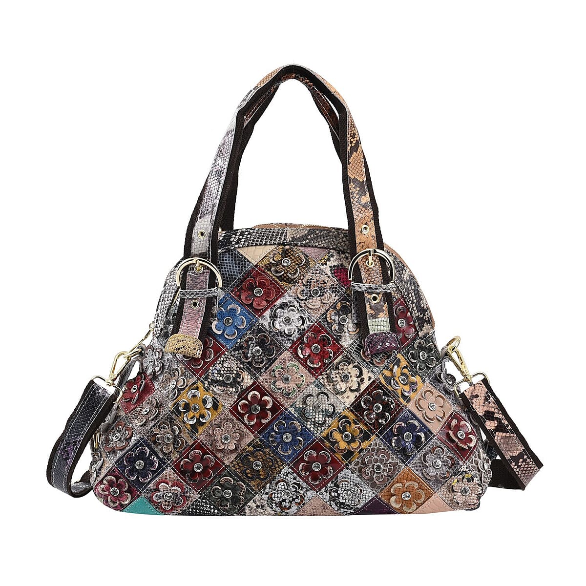 CHAOS By Elsie Rainbow Color Snake Print Genuine Leather Stripe & 3D Flower Pattern Convertible Tote Bag with Long Shoulder Strap
