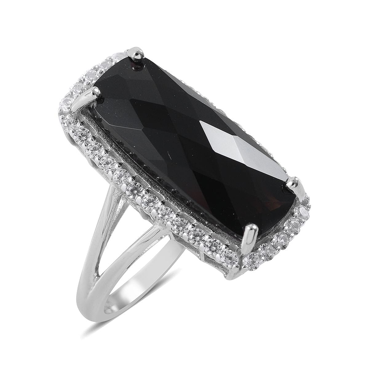 Checkerboard Cut Thai Black Spinel and White Zircon Ring in Platinum Over Sterling Silver (Size 7.0) 13.75 ctw