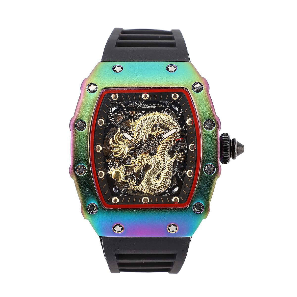 CHINESE NEW YEAR SPECIAL Genoa Automatic Mechanical Movement Golden Dragon Dial Watch with Black Silicone Band and Glass Back