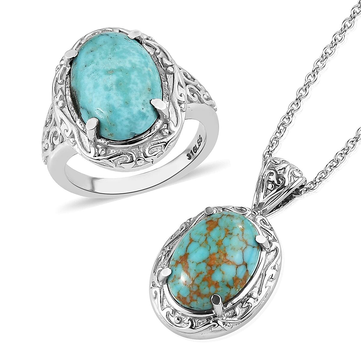 Chinese Turquoise Solitaire Ring (Size 8.0) and Pendant Necklace 20 Inches in Stainless Steel 8.50 ctw