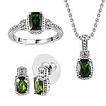 Chrome Diopside and Green Sapphire 3.40 ctw Stud Earrings, Ring (Size 7.0) and Pendant in Platinum Over Sterling Silver with Stainless Steel Necklace 20 Inches