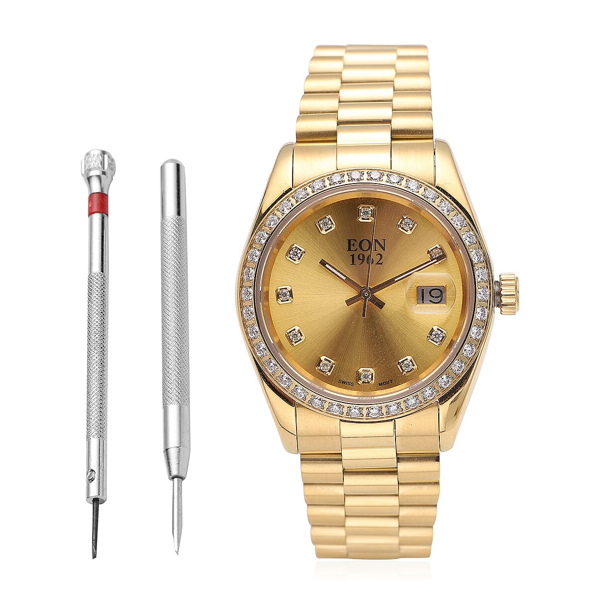 CHUCK CLEMENCY COLLECTION Eon 1962 Made with Finest CZ Swiss Movement Watch in ION Plated YG Stainless Steel with Ear Fork and Screwdriver(31 mm)
