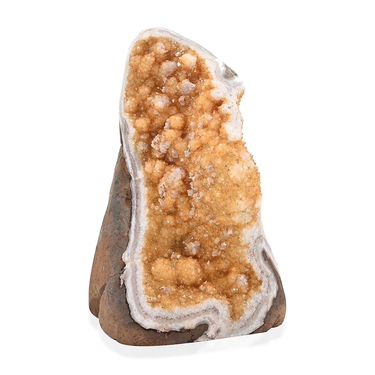 This citrine cut base is an exquisite piece of gemstone decor, skillfully cut to display the natural allure of a citrine geode. Standing upright, it highlights the gem's deep hues and complex crystal patterns. As a decorative element, it captures the eye with its vibrant colors and distinctive texture, making it an ideal centerpiece in any setting.