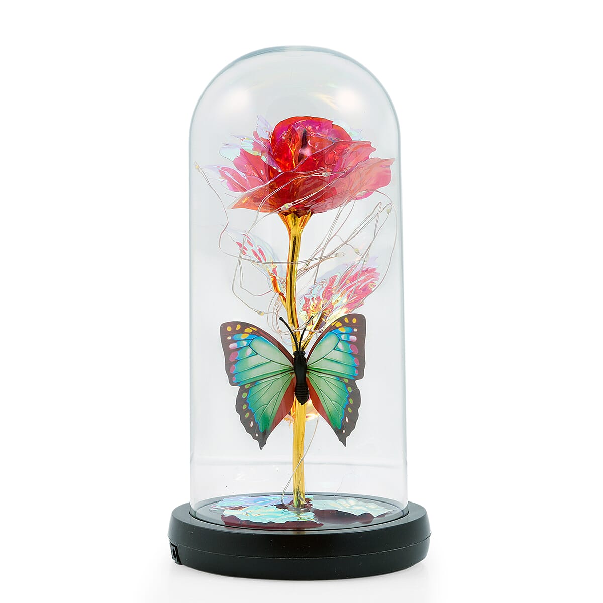 Display the rose & butterfly in glass dome with refined sophistication. This rose glass dome enhances any room with captivating elegance. You'll love how the delicate butterfly and glowing rose create an enchanting ambiance.
