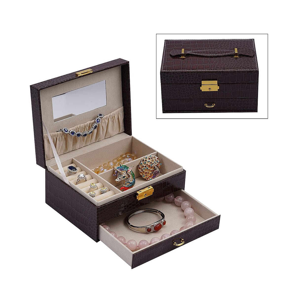 Coffee Croc Embossed Faux Leather 2 Layer Jewelry Organizer With Mirror Lock and Key | Jewelry Box for Women | Portable Jewelry Box | Jewelry Holder | Jewelry Storage | Jewelry Organizer
