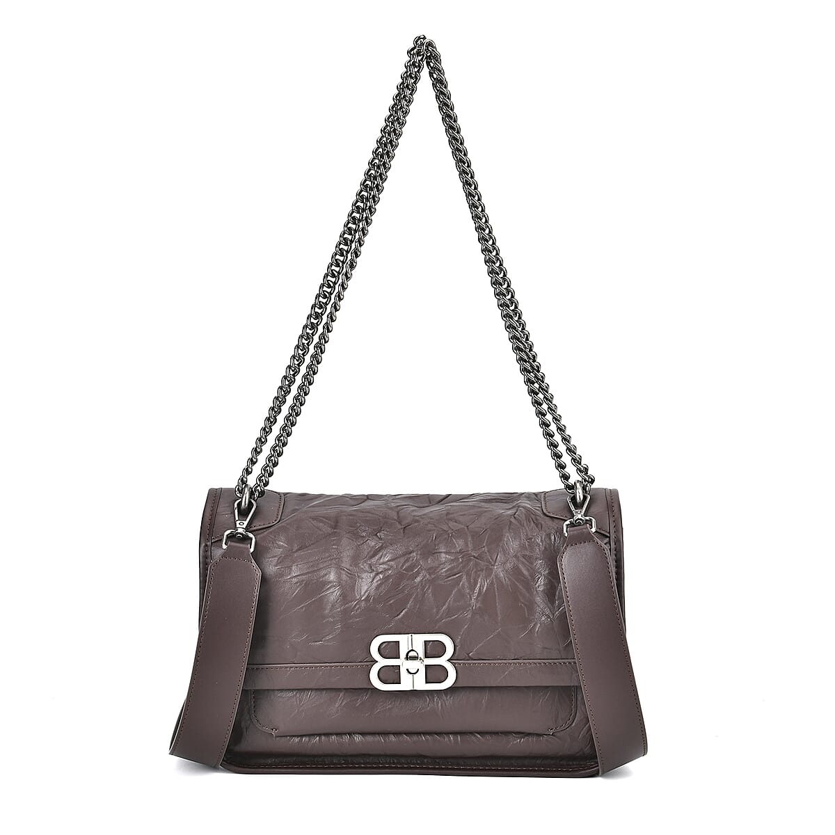 Coffee Genuine Leather Shoulder Bag (10.8"x3.9"x7") with Long Chain Strap and Leather Strap