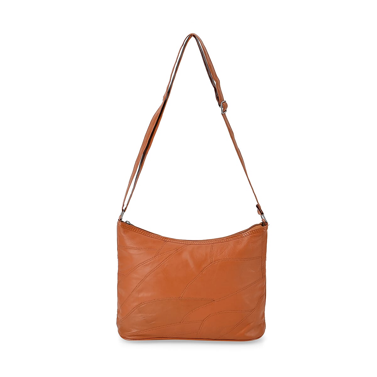 Cognac Color Patch Work Sheep Leather Crossbody Bag For Women with Adjustable Shoulder Strap and Zipper Closure (12x9.5x4'')