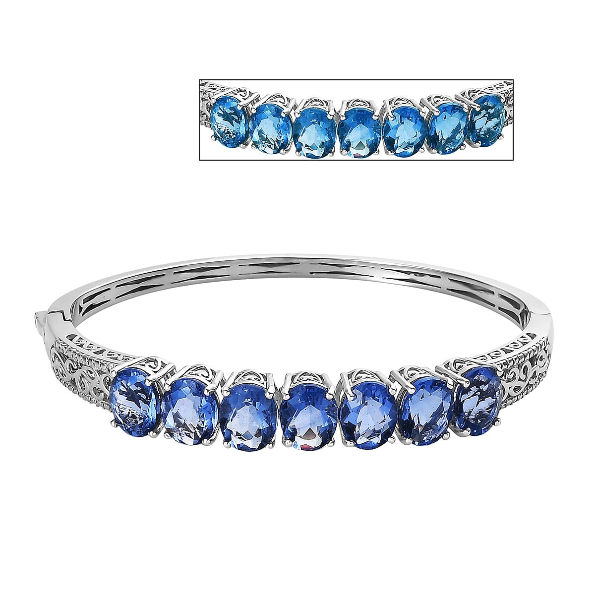 The silver color-change fluorite bangle bracelet showcases seven oval-shaped fluorite stones known for their color-changing properties. This hypoallergenic and sweatproof bracelet symbolizes seven years of togetherness.