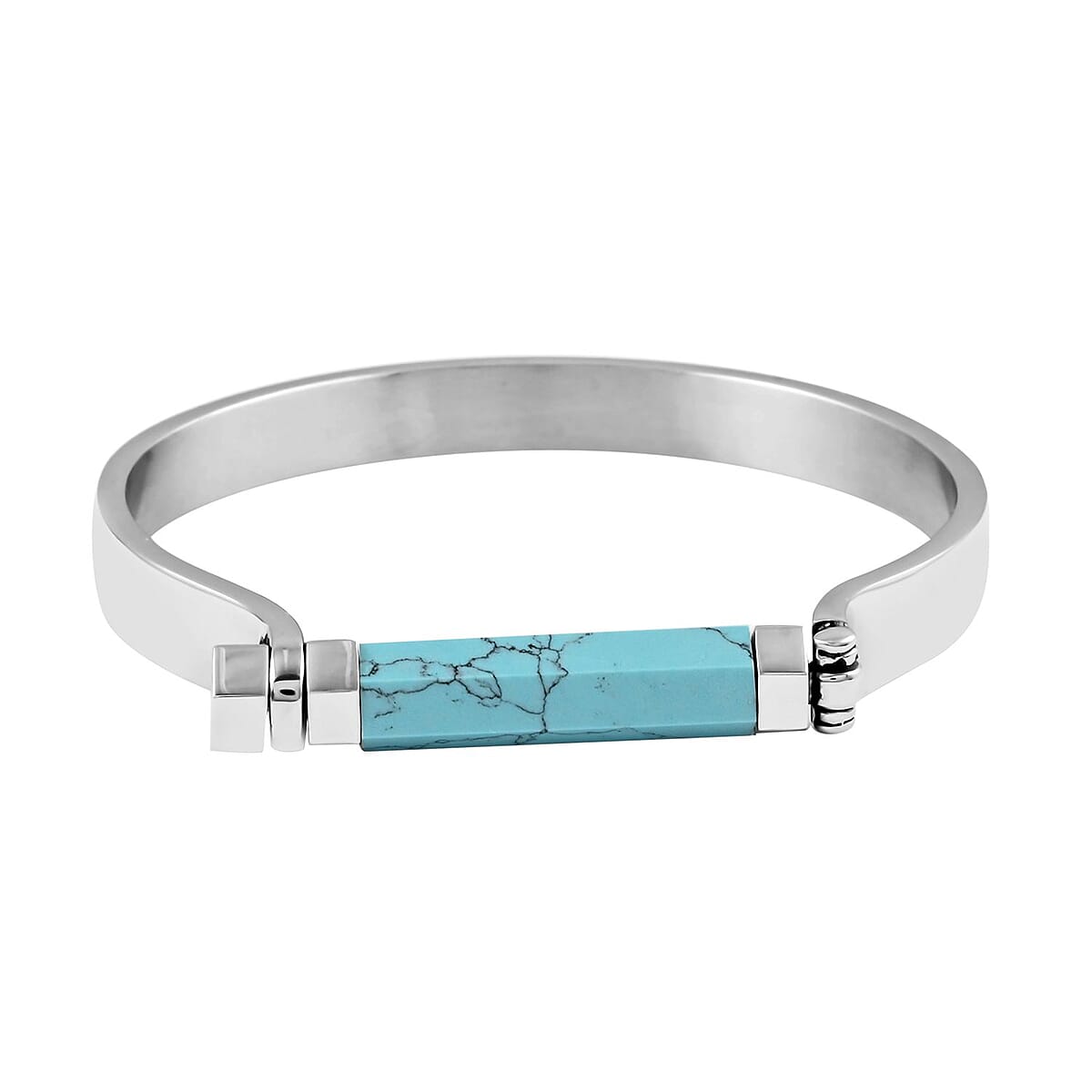 Indulge in the captivating allure of the Blue Howlite Bangle Bracelet in Stainless Steel, an exquisite piece of jewelry that is both stylish and versatile. The alluring blue color of the howlite stones, combined with the sleek shine of the stainless steel, creates a harmonious balance of beauty and strength.