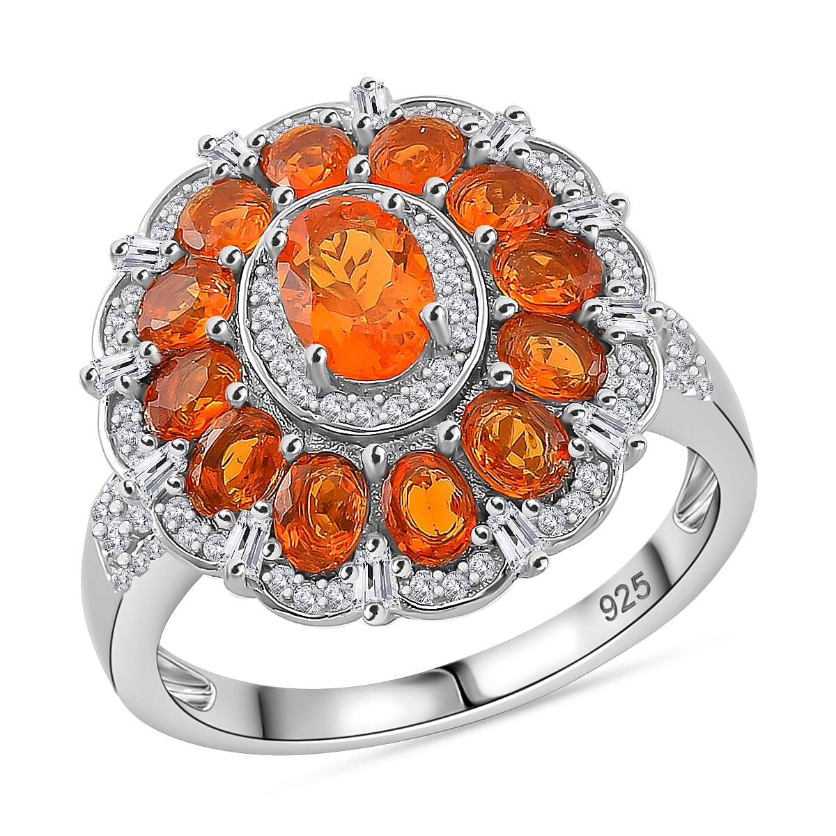 Crimson Fire Opal and Moissanite 2.50 ctw Dahlia Floral Ring in Rhodium Over Sterling Silver (Size 6.0)
